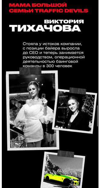 Крім "тата" у "Traffic Devils" також є і мама. Їй є Вікторія Тихачова (Колесник). Про неї відомо не багато. Вона народилася та виросла в Івано-Франківській області. Влаштувалася після заснування Traffic Devils на посаду байєра (звичайного менеджера), але дуже швидко доросла до керівництва. Тихачова на 2 роки старша за засновника компанії, і є нібито CEO (директором) «Traffic Devils». Чому «нібито» відповідь проста: компанія не зареєстрована на території України. Від слова зовсім. Весь багатомільйонний виторг і прибуток іде чорним налом.