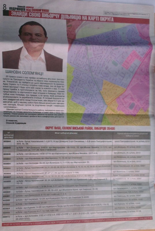 Мій знайомий приніс агітаційну газету Олексія Кудрявцева, кандидата у депутати Київради від ВО «Батьківщина» по округу №50. В цій газеті остання шпальта має заголовок «ЗНАЙДИ СВОЮ ВИБОРЧУ ДІЛЬНИЦЮ НА КАРТІ ОКРУГА».