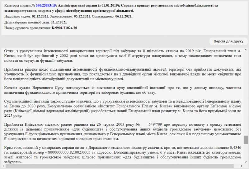 Врешті-решт, 2 грудня 2021 року Касаційний адмінсуд повністю задовольнив вимоги ТОВ “Етрекс”, зобов’язавши Департамент містобудування та архітектури КМДА видати МУО на проєктування забудови на Володимирському узвозі, 6.