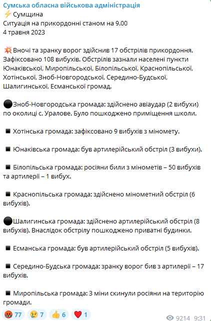 В Уралово Сумської області пошкоджено два приватні будинки, адміністративну будівлю та заклад.