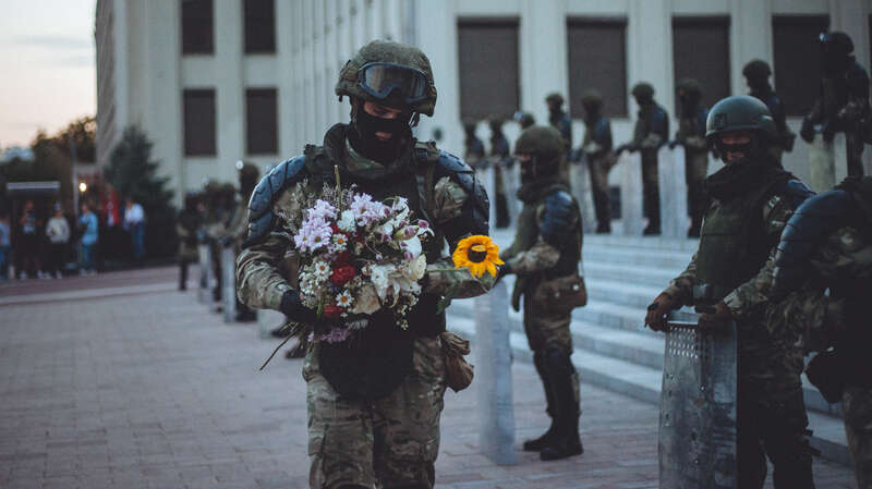 Протест білорусів проти підсумків виборів 2020 року підкреслено мирним. На кадрах протестів чітко видно, що силовики нападали на протестувальників – а не протестувальників силовиків. Приклади чогось подібного до силового протистояння були поодинокими: хіба що барикади в перші ночі протестів та випадки самооборони від силовиків (часто без знаків, нерідко – «людей у цивільному»). Не було такого, щоб у силовиків масово летіло каміння, коктейлі Молотова чи кулі.