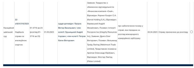 Як результат, представники ТОВ "Фінансова компанія "СКАЙ" подали апеляційну скаргу на ухвалу Київського апеляційного суду від "01" березня 2023 року про вжиття заходів щодо забезпечення позову у справі, переданій на розгляд міжнародного комерційного арбітражу до Касаційного цивільного суду (розглядає такі категорії справ згідно з за цікавим збігом обставин, головуючим суддею з розгляду даної апеляційної скарги став ще один наш старий гравець “Команда Олексія Філатова” - Віктор Васильович Пророк. Розгляд апеляційної скарги призначено на “11” травня 2023 року.