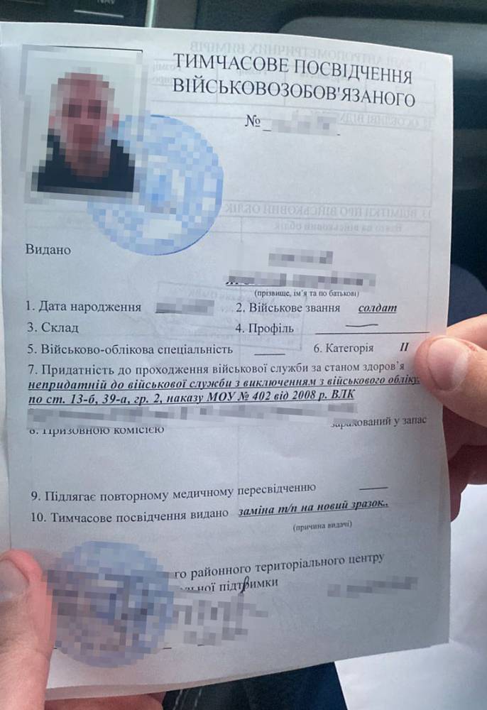Підозрюваний через знайомих пропонував чоловікам, яким заборонено виїзд за межі держави на період дії воєнного стану, організувати безперешкодний перетин кордону на підставі так званого «білого квитка» — довідки про нібито непридатність для військової служби. Коштував документ дев’ять тисяч доларів.