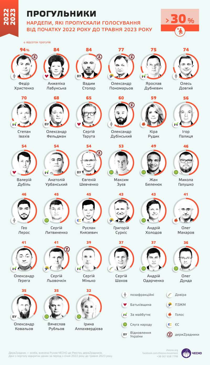 У трійці прогульників: Федір Христенко (94%), екс-ОПЗЖ і зараз позафракційний, Анжеліка Лабунська (84%) з “Батьківщини”, а також скандально відомий представник “батальйону Монако”, колишній представник ПР та ОПЗЖ, а нині один з лідерів групи “Відновлення України” Вадим Столар (83%), зазначає видання LB.ua.