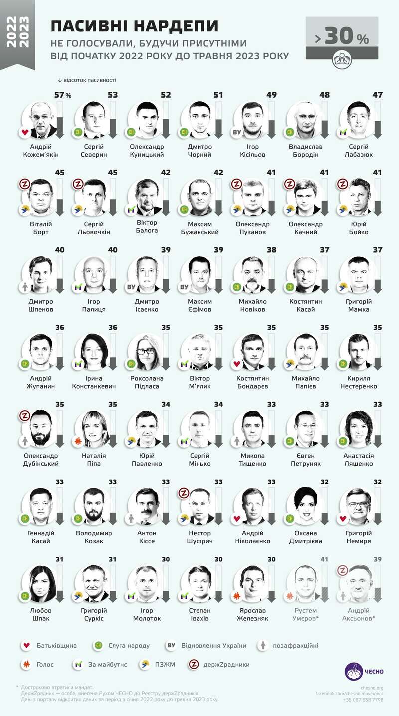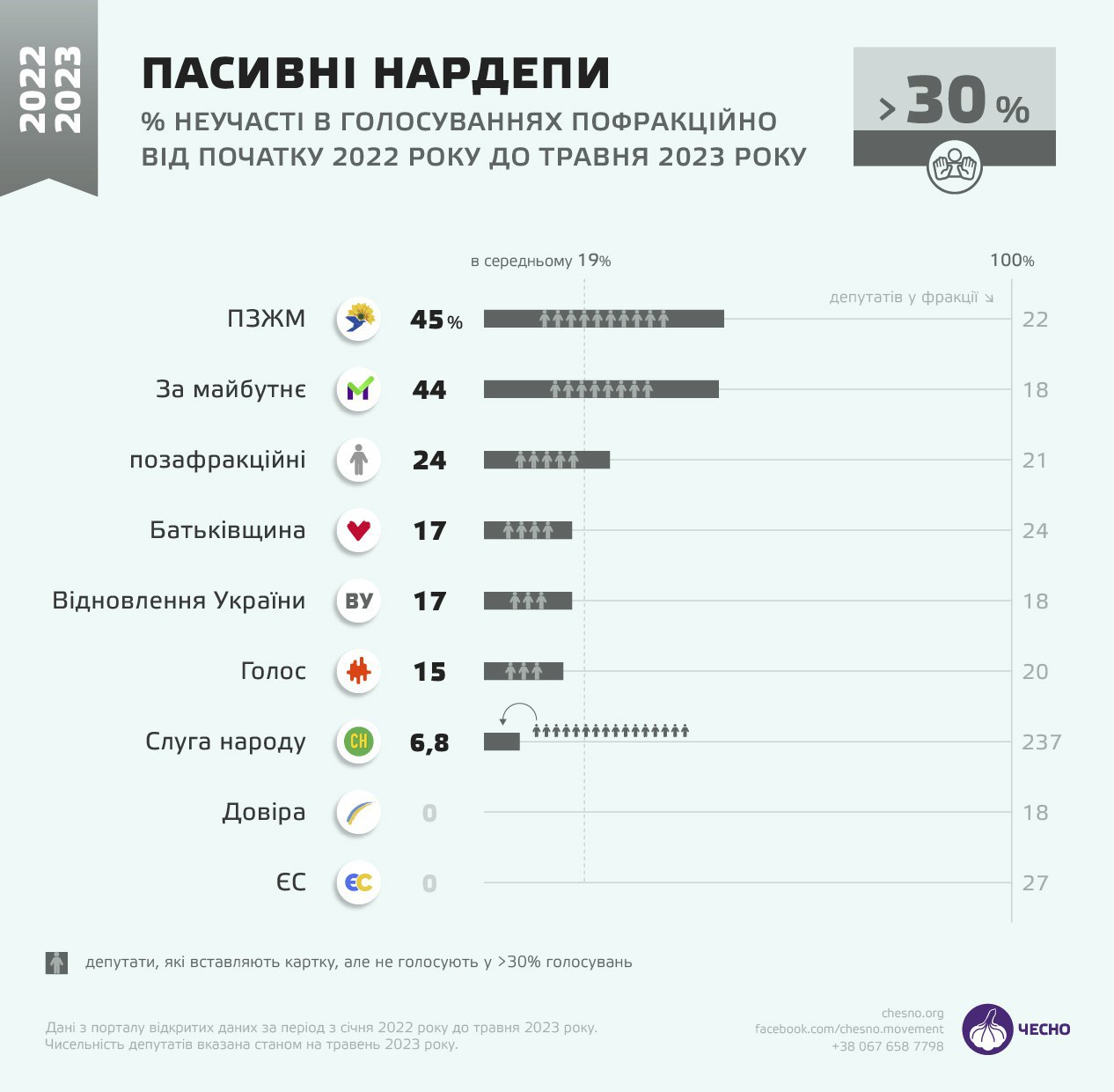 Водночас загалом від початку 2022 року і дотепер найбільший відсоток нардепів, які мають понад 30% неучасті в голосуваннях, – у групах ПЗЖМ (45%) та "За майбутнє" (44%). Натомість найменше пасивних депутатів – у фракціях "Слуги народу" (6,8%) та "Голосу" (15%). Але стосовно “слуг”, то це доволі типова ситуація і для місцевих рад, коли партія, яка має більшість, має кращу явку і участь у голосуваннях, бо саме їй потрібні голоси для ухвалення рішень.