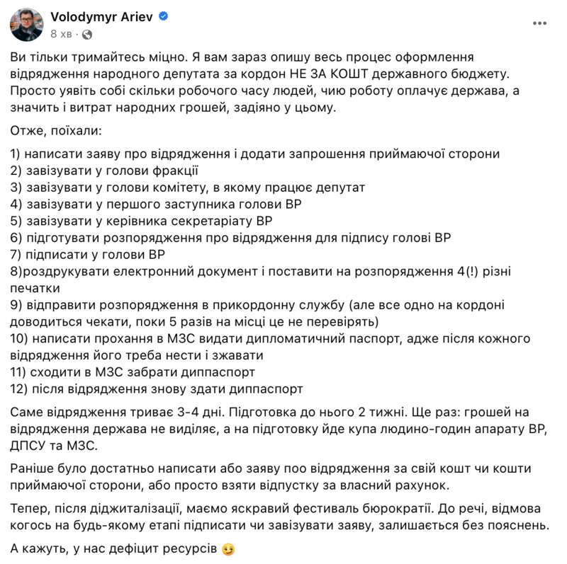 Водночас нардеп від фракції “Європейська солідарність” Володимир Ар’єв так описав чинний процес оформлення відрядження нардепа за кордон не за кошт держбюджету: