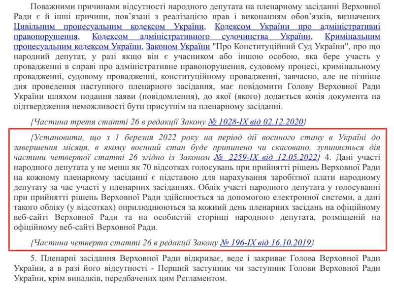 Проте торік у травні під час розгляду проєкту “Про правовий режим воєнного стану” (№7269) нардепи на чолі з Віталієм Безгіним (“Слуга народу”) внесли зміни і зупинили дію цієї норми Регламенту ВРУ. Відтак з 1 березня 2022 року ті, хто не бере участі в голосуваннях парламенту, депутатські отримують. І такий підхід, безперечно, є нелогічним, і його потрібно змінити.
