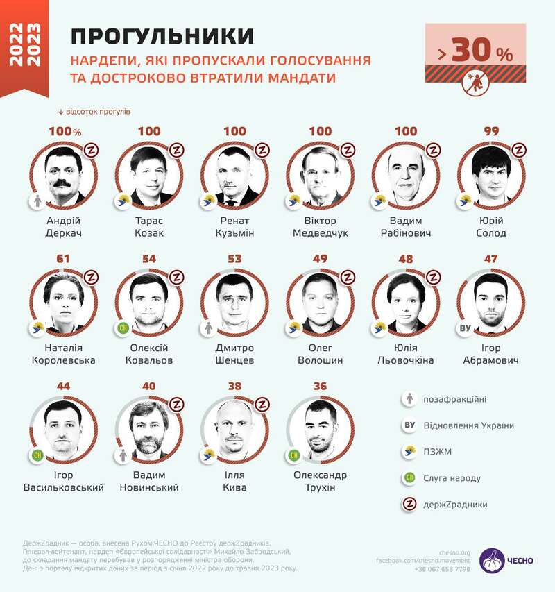 Наприклад, представники забороненої партії ОПЗЖ Віктор Медведчук, Тарас Козак, Ренат Кузьмін та ін. А також позафракційні проросійські нардепи Андрій Деркач, Вадим Новинський, Андрій Аксьонов. Майже всі вони були відсутні протягом цього часу у Верховній Раді і не голосували, цих нардепів достроково позбавили мандатів, і ми винесли їх на окрему інфографіку.