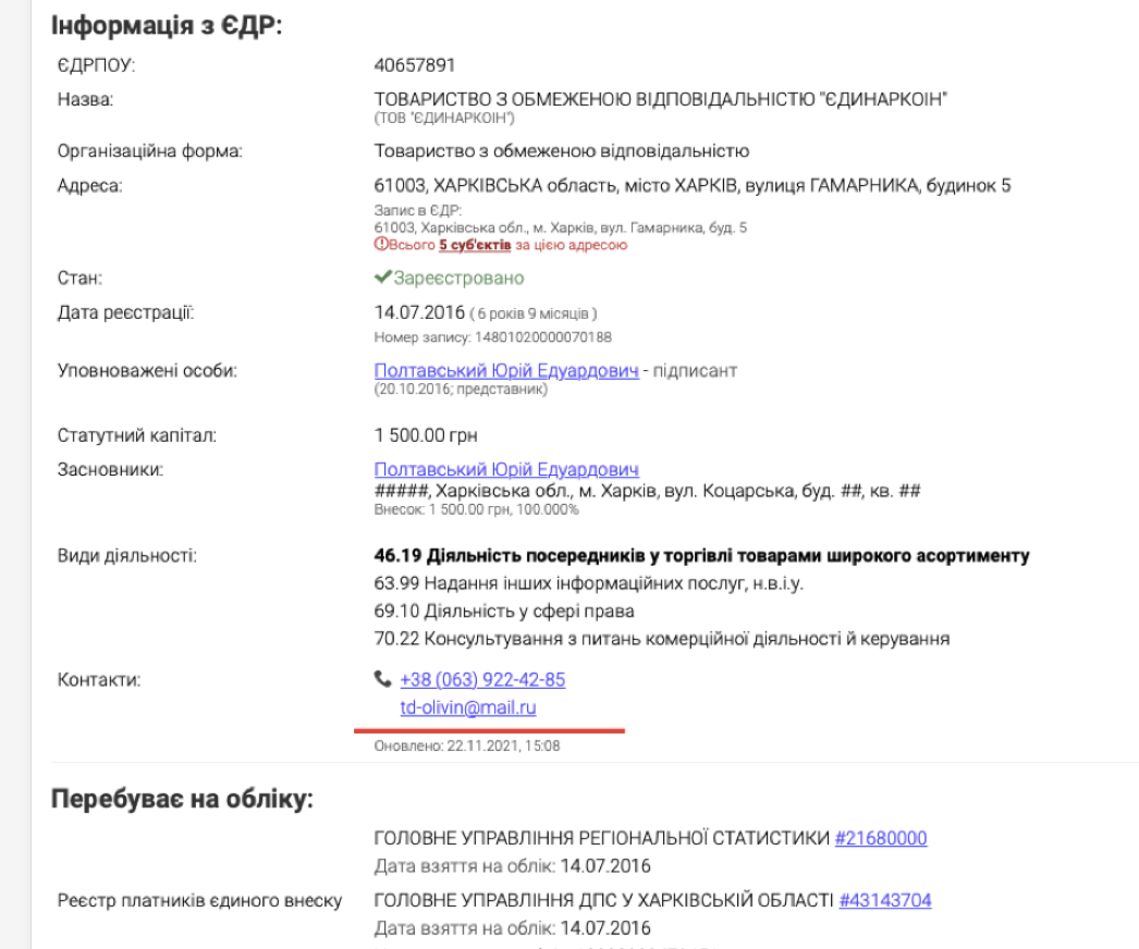 Є й ще одна компанія, яка досі належить відкрито Удянському, і яка пов’язана з криптовалютою. Це компанія «Єдинаркоїн». Але ось керівником цього підприємства є досить неординарний СЕО-менеджер зі сфери ІТ - Полтавський Юрій Едуардович. З ним, судячи з адреси імейлу, Удянський знайомий ще з часів своєї першої роботи на початку 2000-х в торговому домі «Олівін».