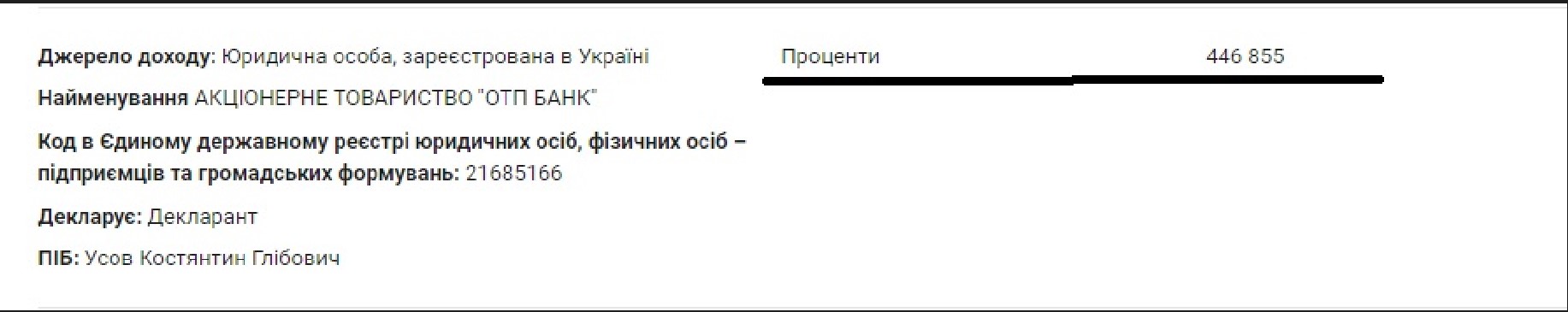 Ще до того, як «слуги» засекретили декларації, щоб вороги не дізналися, хто і скільки з них вкрав, у Костянтина Усова виявився вклад у банку, на який за рік набігло майже півмільйона гривень лише відсотків. Ви уявляєте розмір вкладу?