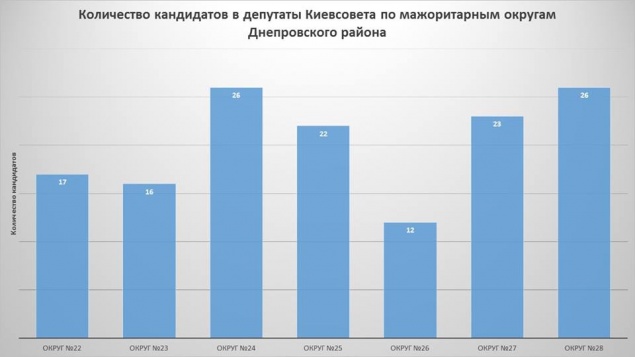 На семи мажоритарных округах Днепровского района столицы за мандаты депутатов Киевсовета борется 140 кандидатов. На каждом днепровском округе баллотируются кандидаты от «УДАРа», «Свободы», Демократической партии Украины и Радикальной партии Ляшко. Кроме того, по Днепровскому району идут кандидаты 14-ти других политсил. Среди днепровских «мажоритарщиков»: главврач больницы, боксер-любитель, несколько нынешних депутатов Киевсовета, предпринимателей и безработных.