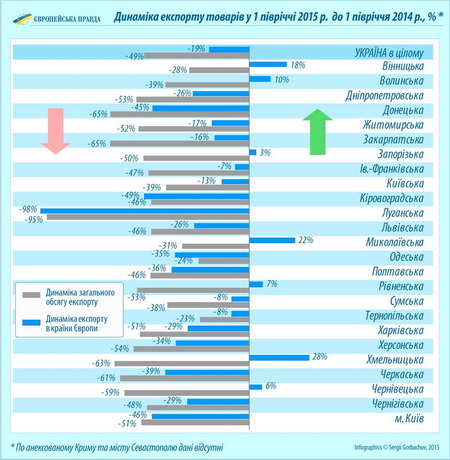 Дійсно, найбільші темпи падіння експорту до Європи фіксуються у Донецькій (-45%) та Луганській (-98%) областях.