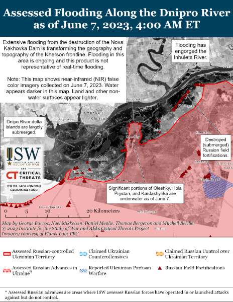 "Оцінка ситуації Сальдо ігнорує втрату Росією першої лінії підготовлених укріплень. Кількість російської важкої техніки, втраченої за першу добу затоплення, також незрозуміла", - пишуть експерти ISW.