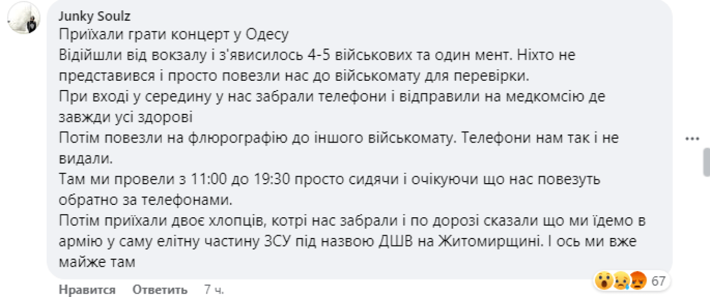"Відійшли від вокзалу і з’явилося 4-5 військових та один "мент". Ніхто не представився і просто повезли нас у військкомат для перевірки. При вході всередину у нас забрали телефони та відправили на медкомісію, де завжди всі здорові. Потім повезли на флюорографію в інший військкомат. Телефони нам так і не видали. Там ми провели з 11:00 до 19:30 просто сидячи й чекаючи, що нас повезуть назад за телефонами", — розповів музикант.