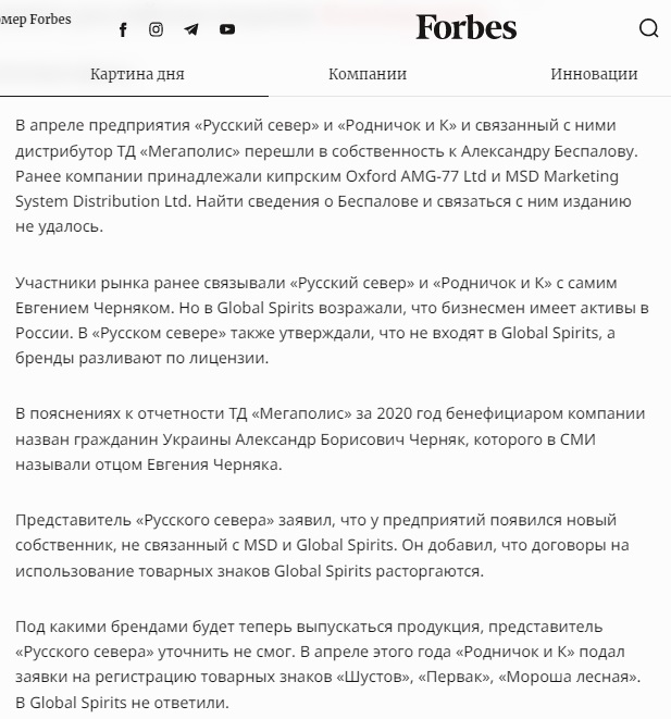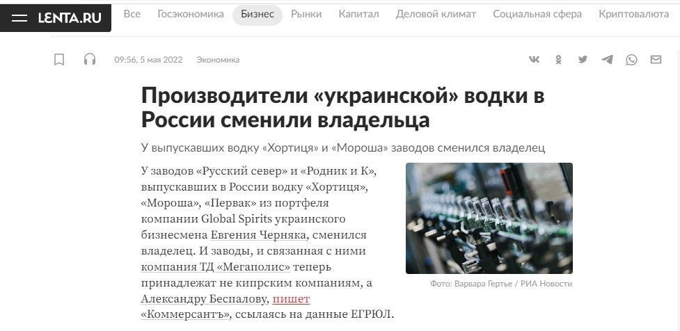 Насправді публікацій було більше, але їхня суть зводилася то того простого факту, що Євген Черняк переписав свій горілчаний бізнес у Росії на підставну особу. Але зміна власника заводів «Русский север» у Вологодській області та «Родник и К» у Підмосков’ї, що входять до алкогольного холдингу Черняка Global Spirits, і займаються в Росії випуском горілок «Хортиця», «Мороша» та «Первак» - чиста формальність.