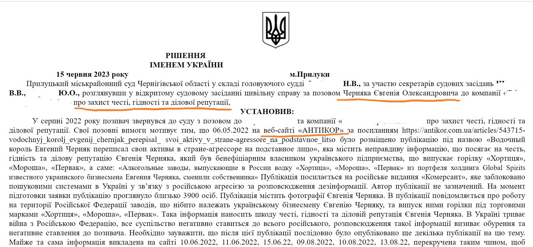 Якщо перекласти цю юридичну мову на нормальну, то із рішення суду випливає – всі публікації, у яких «Антикор» писав про наявність горілчаного бізнесу Євгена Черняка у Росії, про те, що він сплачує мільярди рублів до бюджету країни-агресора, про те, що горілчана продукція з російських заводів пана Черняка продається в магазинах на окупованих територіях – правда.