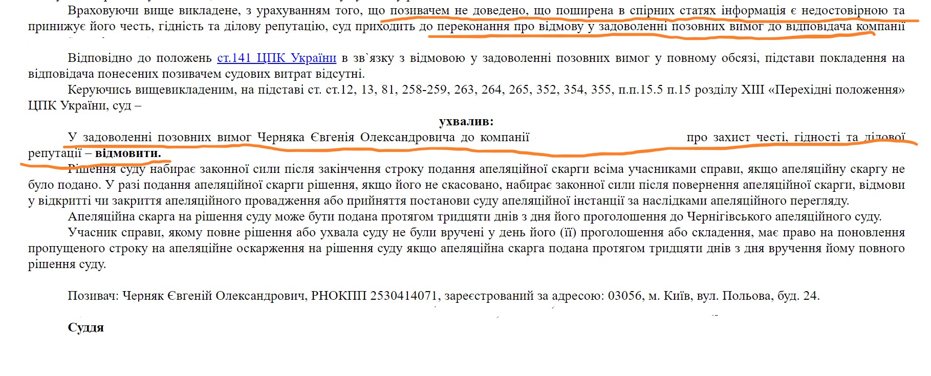 Причому суд підкреслив, що у задоволенні претензій Черняку відмовлено саме тому, що «позивачем не доведено, що поширена в спірних статях інформація є недостовірною та принижує його честь, гідність та ділову репутацію».