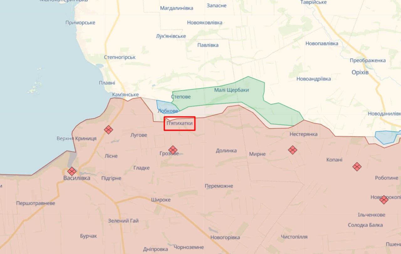 Крім того, російські воїнкори другий день зазначають, що населений пункт П’ятихатки у Запорізькій області був звільнений українськими військами і окупантiв знову відкинули вглиб.