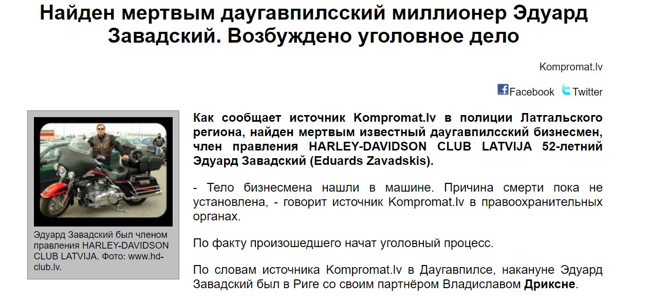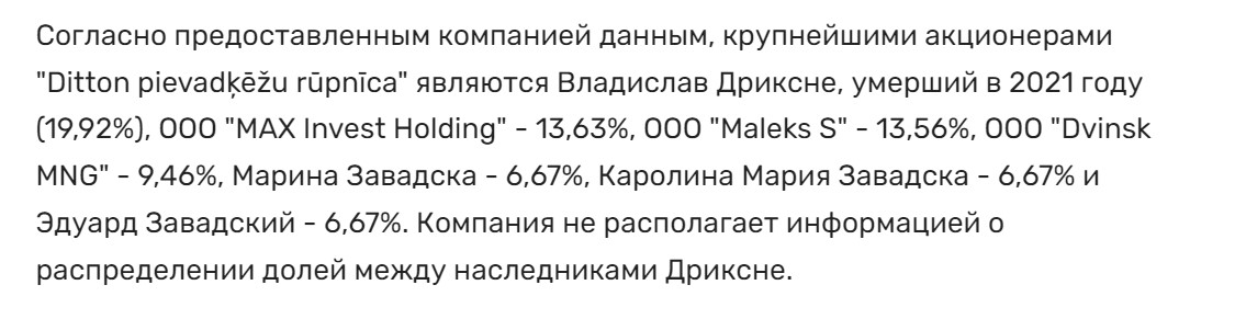 Це Владислав Дріксне, який помер у 2021 році, та Едуард Завадський, який помер у 2016 році. Владиславу Дріксне належало 19,92% частки в заводі Ditton pievadķēžu rūpnīca, Едуарду Завадському – 20%. І обидві ці смерті виглядають украй підозрілими, а причин смертей співвласників заводу, який постачає в обхід санкцій продукцію до Росії, досі не з’ясовано.