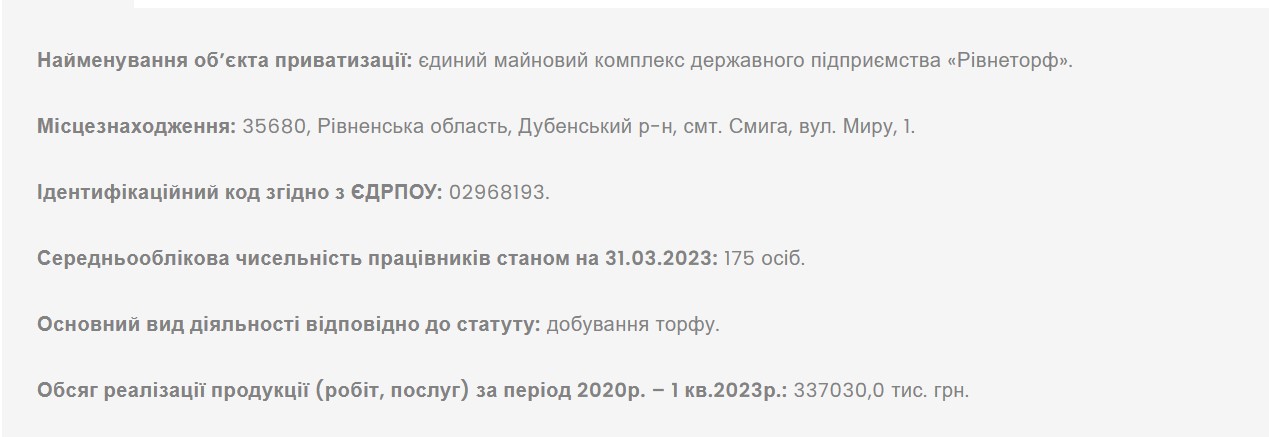Ціна продажу становила 205 000 001 гривню. Причому цікаво: переможець обійшов свого найближчого конкурента за право купити «Рівнеторф» лише на одну гривню.