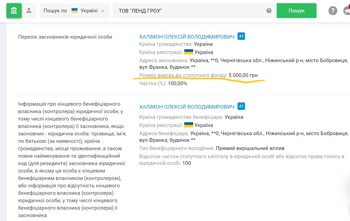 Бентежить не лише розмір статутного капіталу ТОВ «Ленд гроу» - 5 тисяч гривень.
