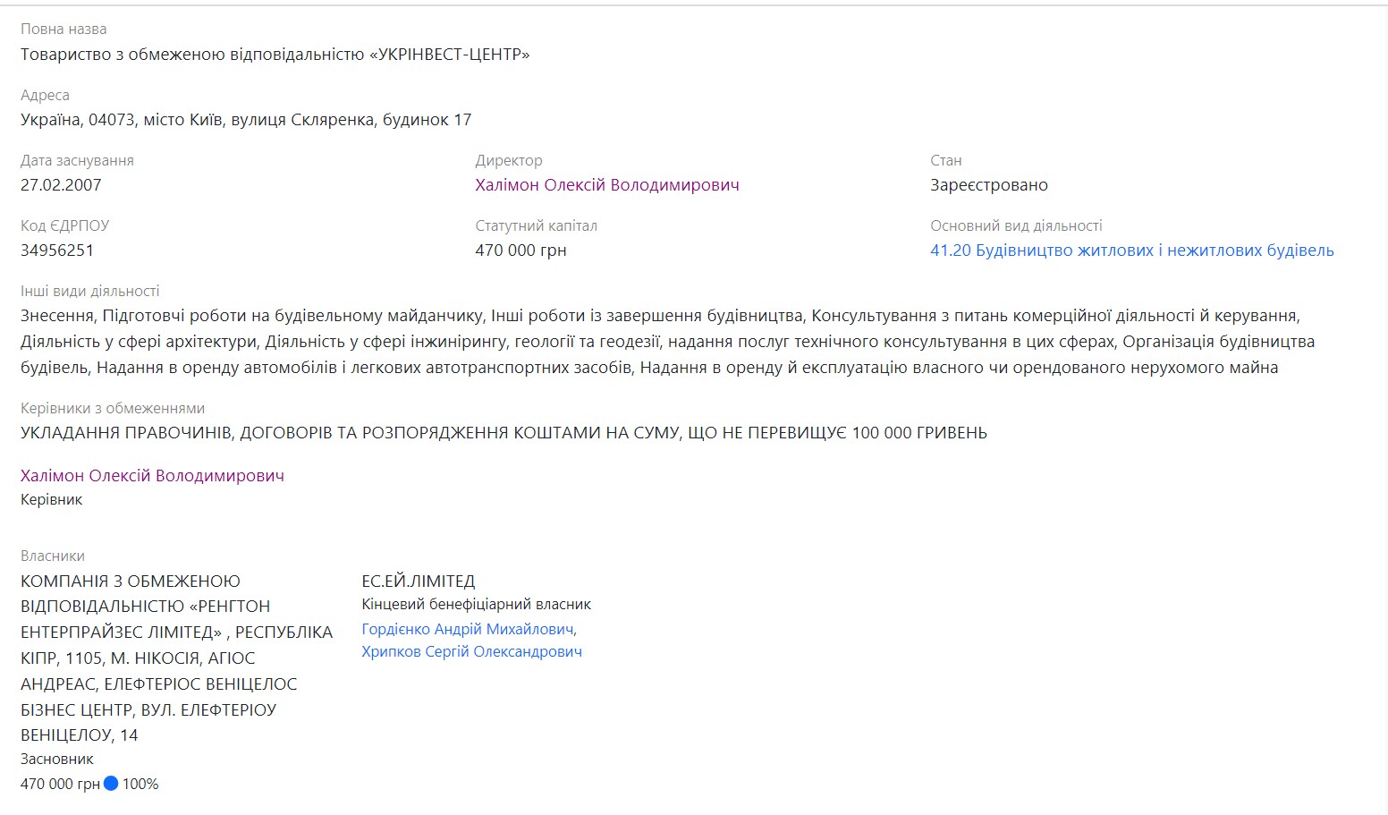 І через одне з них – ТОВ «Укрінвест-центр» - пов’язане з Андрієм Гордієнком та Сергієм Хрипковим: