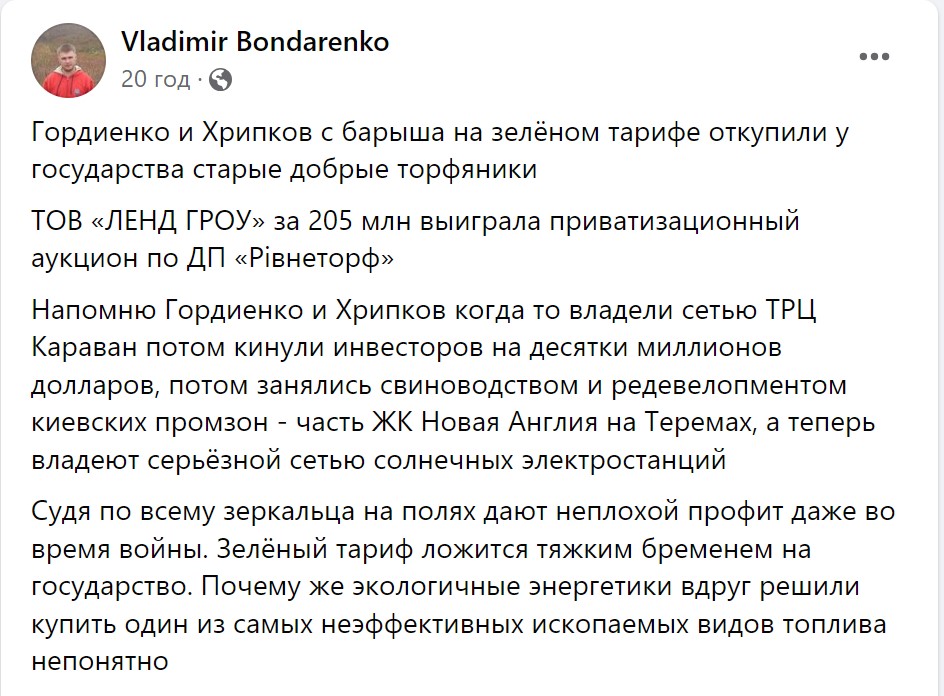 Тож навряд чи інформація про те, що Гордієнко та Хрипков стоять за покупкою ДП «Рівнеторф», є неправдивою. Особливо з огляду на те, що багато наближених до «зеленої влади» сильно «пасуться» на так званих «зелених тарифах», продаючи державі електроенергію, отриману від сонячних або вітряних джерел, за дуже вигідними для себе цінами.