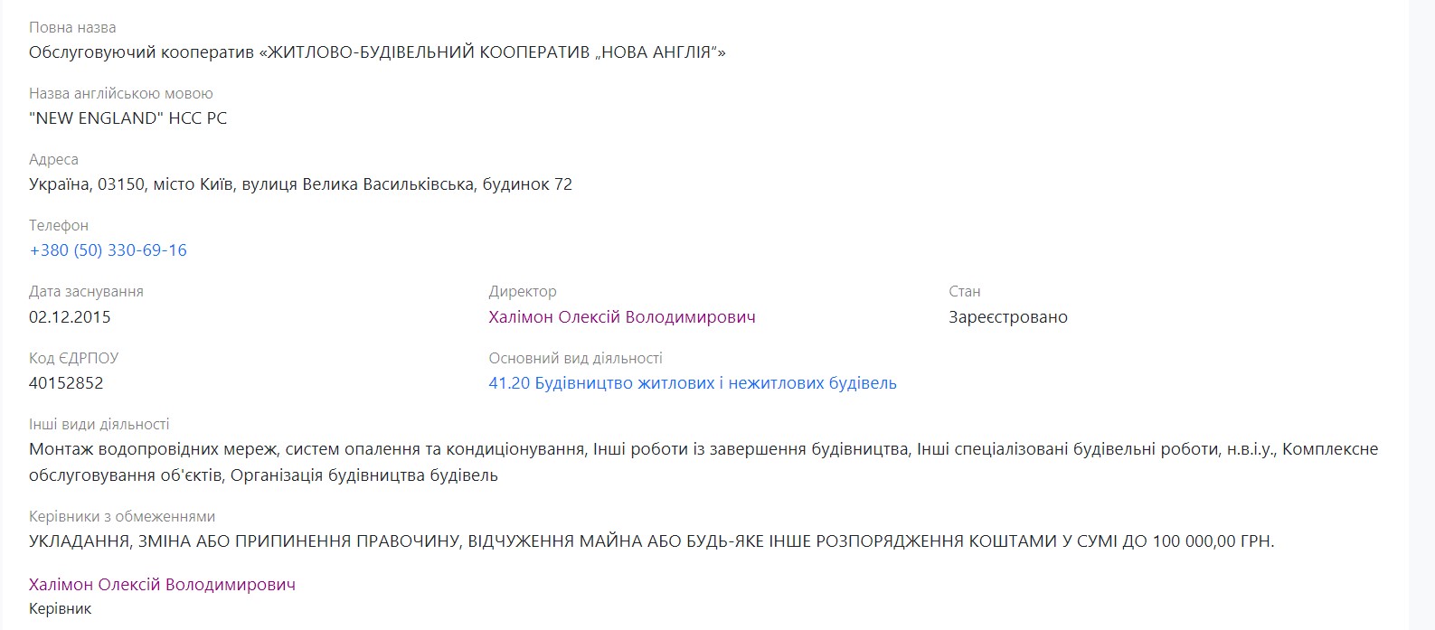 До речі, Олексій Халімон є директором обслуговуючого кооперативу ЖБК «Нова Англія»: