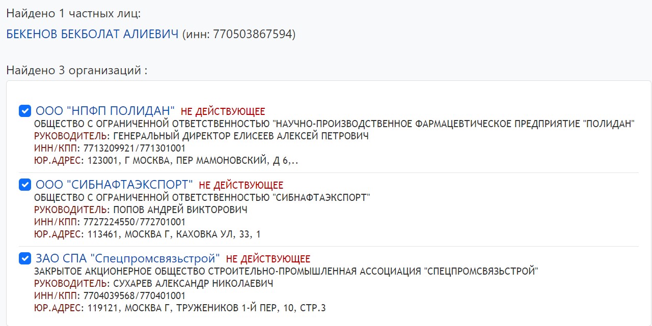 Про першого відомо, що він має громадянство Росії та Кіпру і з 2012 року проживає у Швейцарії, оформлюючи посвідку на проживання в Англії. У Росії Бекенов був засновником трьох фірм, усі вони нині ліквідовані: