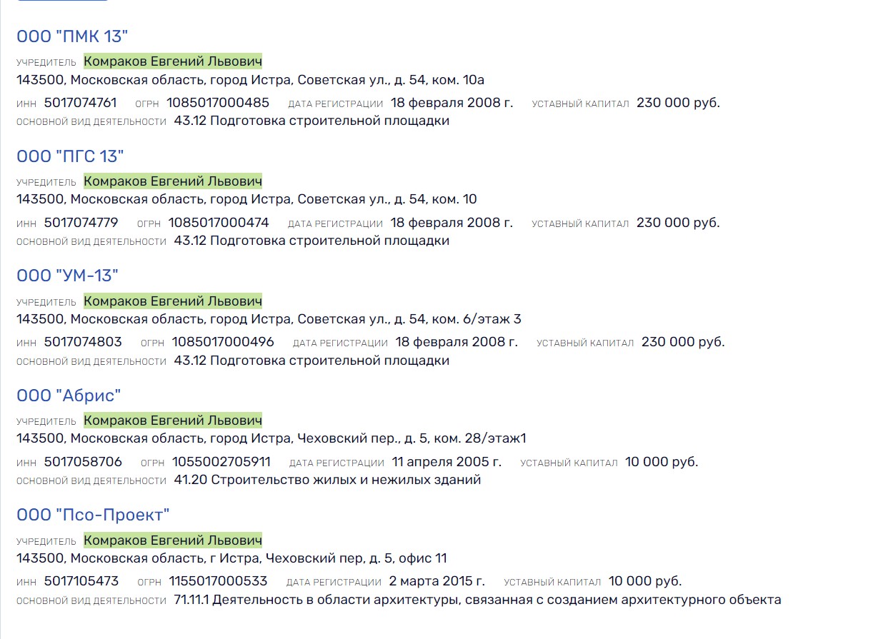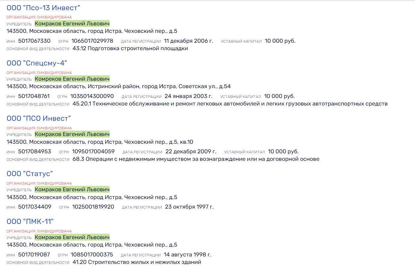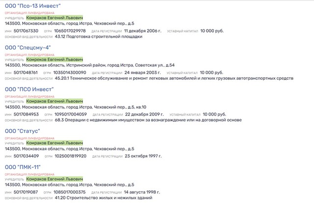 Усі вони пов’язані з будівництвом і діють у Істринському районі. Що говорить нам про те, що жодних проблем із законом у пана Комракова-Кобякова немає. Фірми, замішані у виведенні грошей із Фуксовського проекту, пан Комраков благополучно ліквідував:
