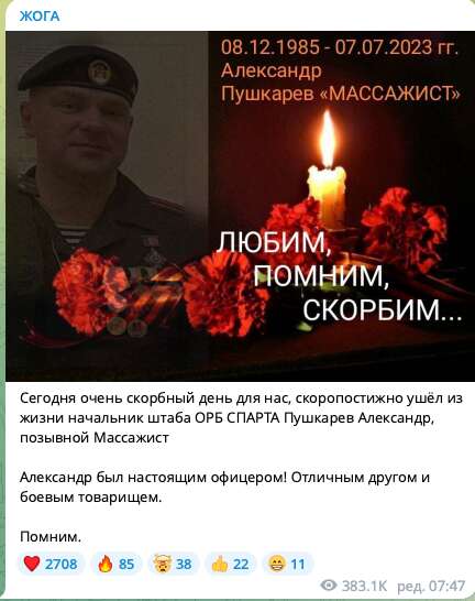 "Сьогодні дуже скорботний день для нас, раптово пішов із життя начальник штабу ОРБ "Спарта" Пушкарьов Олександр, позивний "Масажист". Олександр був справжнім офіцером! Відмінним другом та бойовим товаришем", – написав окупант.