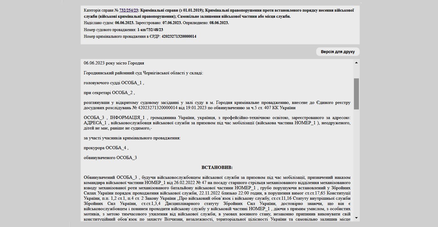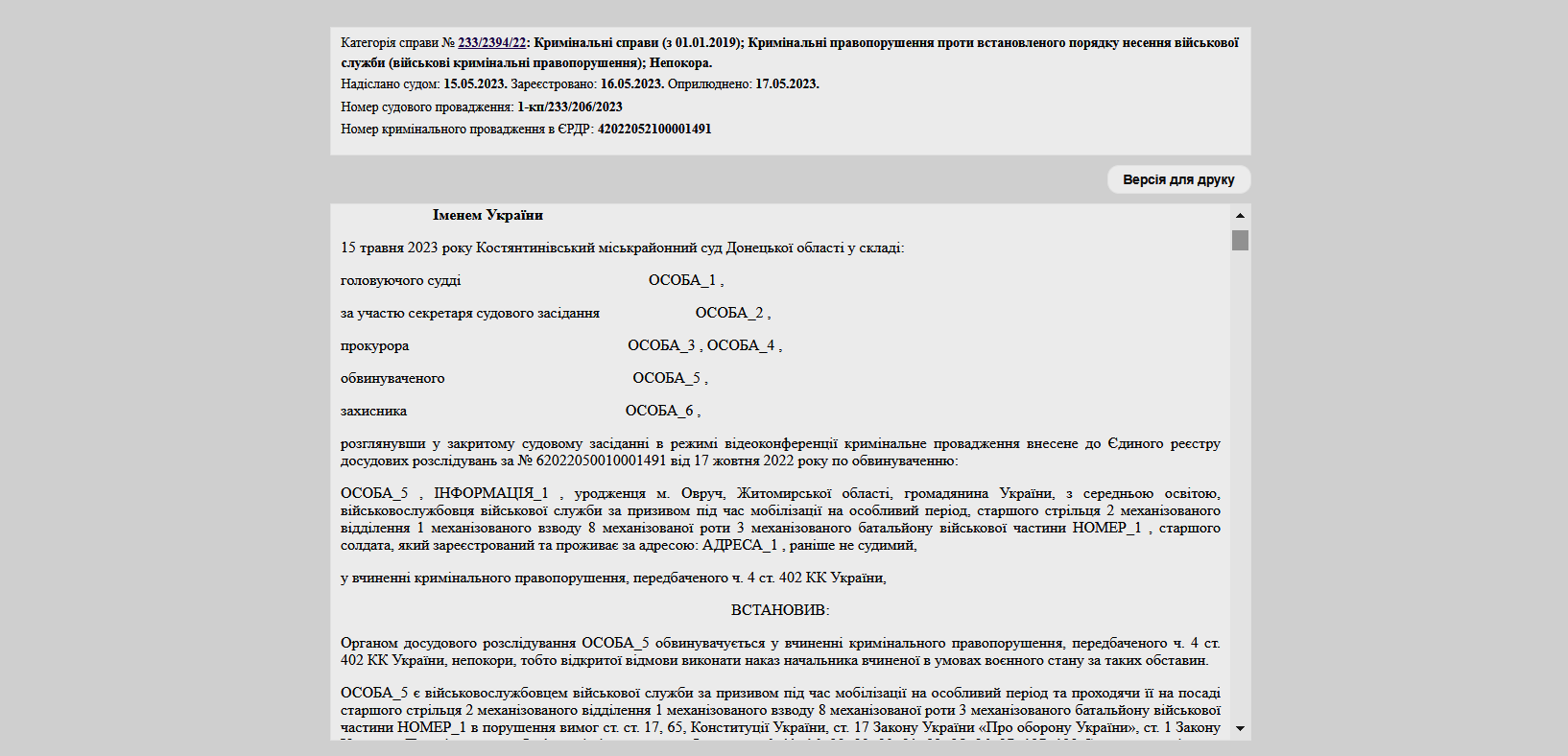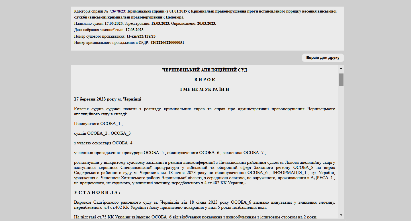 Є вирок Чернівецького апеляційного суду за березень, коли солдат-контрактника посадили на 5 років, змінивши рішення першої інстанції. Як сказано в рішенні суду, солдата викликали для оголошення наказу. Там сиділи три чи чотири офіцери, тобто вони вже готувалися до передання справи в Державне бюро розслідувань, щоб це всі засвідчили, склали рапорти й акт. Так зафіксовано, що солдат відмовився виконувати наказ “із хибно зрозумілих інтересів служби”.