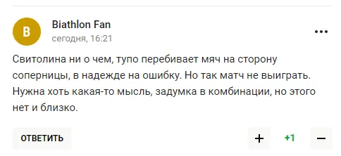 "Світоліна ні про що, тупо перебиває м’яч на бік суперниці, сподіваючись на помилку. Але так матч не виграти. Потрібна хоч якась думка, задум у комбінації, але цього немає і близько", - пишуть любителі тенісу з РФ.