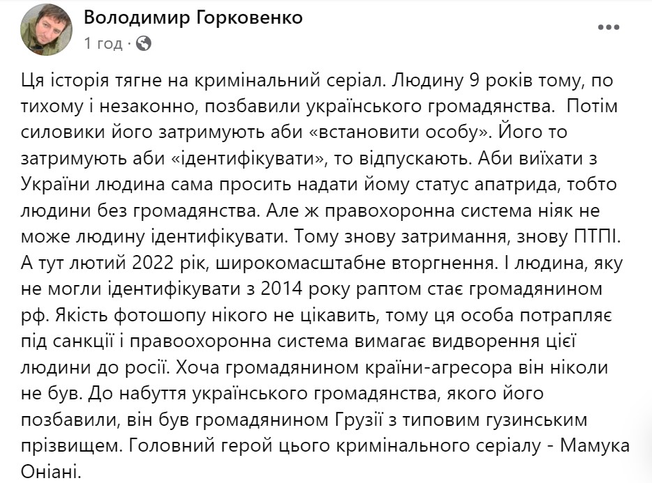 Як пише Горковенко, Мамука Оніані був позбавлений громадянства «тихо і підступно» у 2014 році, однак про це він дізнався лише у вересні 2020 року, коли його затримали працівники ЦМУ ДМС в м. Києві та Київській області і відправили до Миколаївського пункту тимчасового перебування іноземців та осіб без громадянства, які незаконно перебувають в Україні, з метою, зокрема, ідентифікації особи.