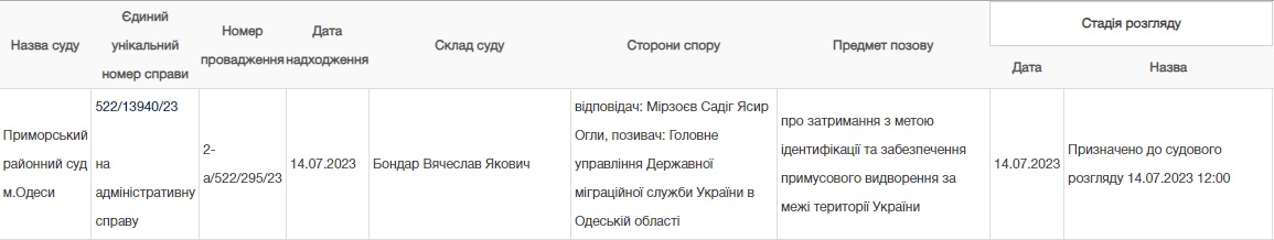 Наразі у взаємодії з одеським управлінням Державної міграційної служби України правоохоронці актуалізували питання щодо примусового видворення Мірзоєва. 14 липня відповідне клопотання надійшло до Приморського райсуду Одеси.
