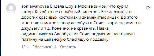 "Бачила шоу в Москві взимку. Що курив автор. Якийсь несерйозний вінегрет. Усе тримається на дорогих гарних костюмах і знаменитих обличчях. До цього багато років дивилася шоу Авербуха в Сочі - "Кармен", "Ромео і Джульєту і т.д. Звичайно, не порівняти. Навка, мабуть, вижила Авербуха з Сочі, підмінивши справжню платину на циганську блискучу підробку ", - пишуть користувачі.