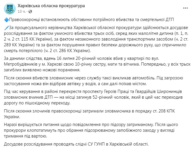 Як з’ясували слідчі, вдень 16 липня 20-річний чоловік убив у квартирі на вул. Метробудівників на Північній Салтівці свою 10-річну сестру, матір та 71-річного діда. У всіх трьох загиблих виявлено ножові поранення.