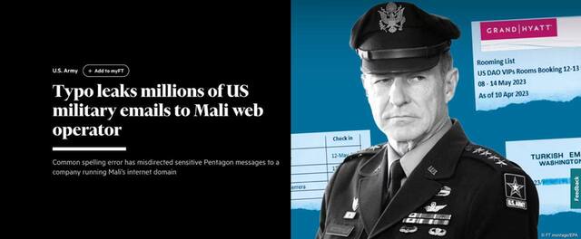 За даними Financial Times, сотні тисяч електронних листів американських військових, у тому числі які містять конфіденційну інформацію про службовців, були помилково відправлені в Малі через опечатку у назві домена.