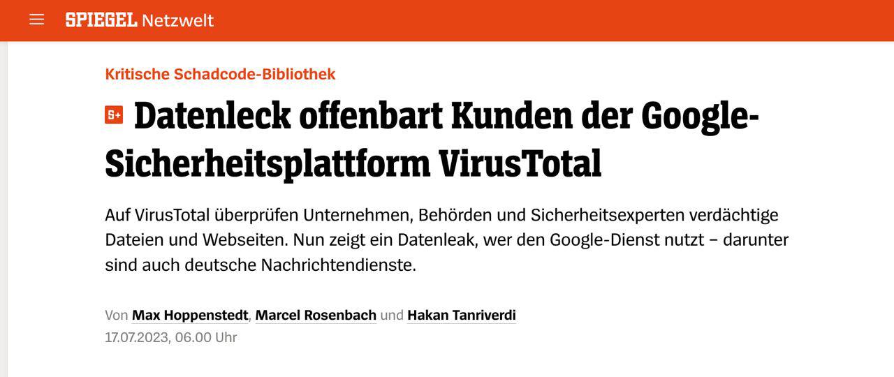 Водночас Spiegel пише, що спецслужби США та Німеччини зіткнулися з витоком даних своїх співробітників через використання онлайн-сканера вірусів VirusTotal.