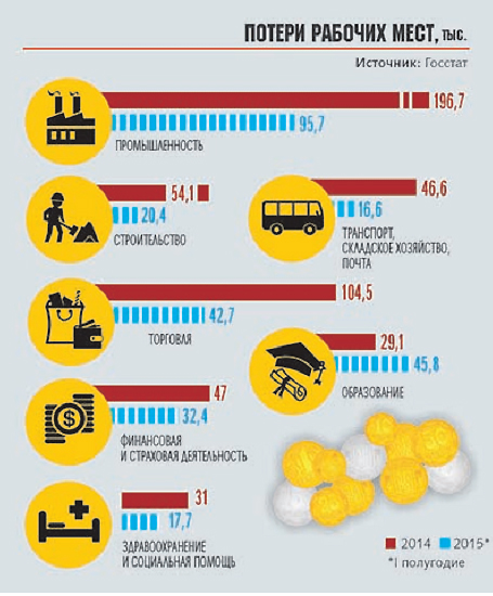 В остальных отраслях пока что не видно улучшения динамики. В первом полугодии 2014 г. они лишились 317,4 тыс. работников, во втором - 323,5 тыс., в первом полугодии 2015 г. - 354,4 тыс., и во втором, если имеющиеся тенденции не переломятся, можно ожидать еще около 400 тыс. Вместе с завершением сезонных работ на селе это даст почти 0,5 млн новых безработных к Новому году.