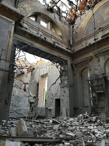 В Одеській єпархії УПЦ МП зазначили, що ворожа ракета потрапила до центрального вівтаря. Через обстріл у соборі спалахнула пожежа.