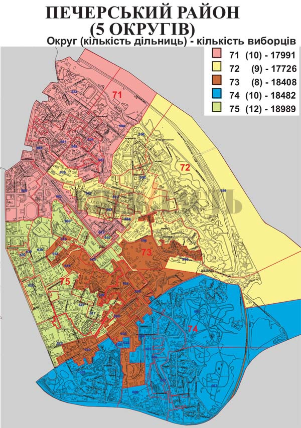 В Печерском районе создано 5 округов, в которых будут работать 49 избирательных участков при ориентировочной численности около 91 596 избирателей.