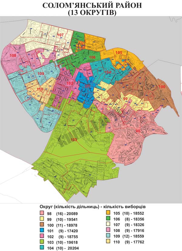 На 13 округов к грядущим выборам поделен Соломенский район столицы, здесь в день волеизъявления будут работать 132 избирательных участка. Ожидается, что избирать в Киевсовет того или иного депутата в этом районе смогут до 244 076 киевлян.
