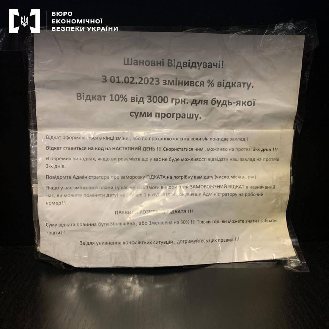 Детективи БЕБ за результатами обшуків місць розташування нелегальних гральних закладів вилучили 63 системних блоки, 79 моніторів, касові апарати, інші технічні засоби та матеріальні цінності, які використовувалися у незаконній діяльності. Окрім того, вилучено чорнову бухгалтерію та мобільні телефони фігурантів.