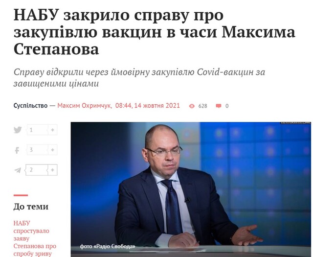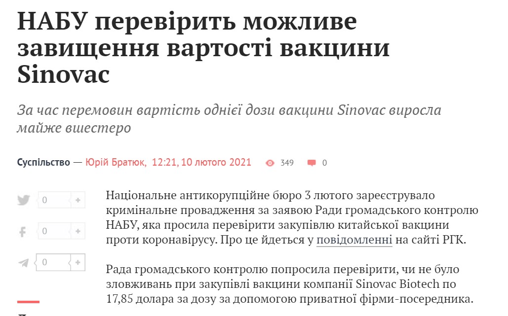 «Спочатку ДП «Медичні закупівлі» розпочало переговори щодо закупівлі вакцини з орієнтовною вартістю близько 3 доларів за дозу… Однак згодом міністр Максим Степанов у ручному режимі зупинив цей процес і доручив розпочати переговори щодо закупівлі китайської вакцини у компанії Sinovac Biotech. Оприлюднена ціна закупівлі 1 дози вакцини стала чи не найвищою у світі – 17,85 долара», - повідомляли тоді НАБУ.