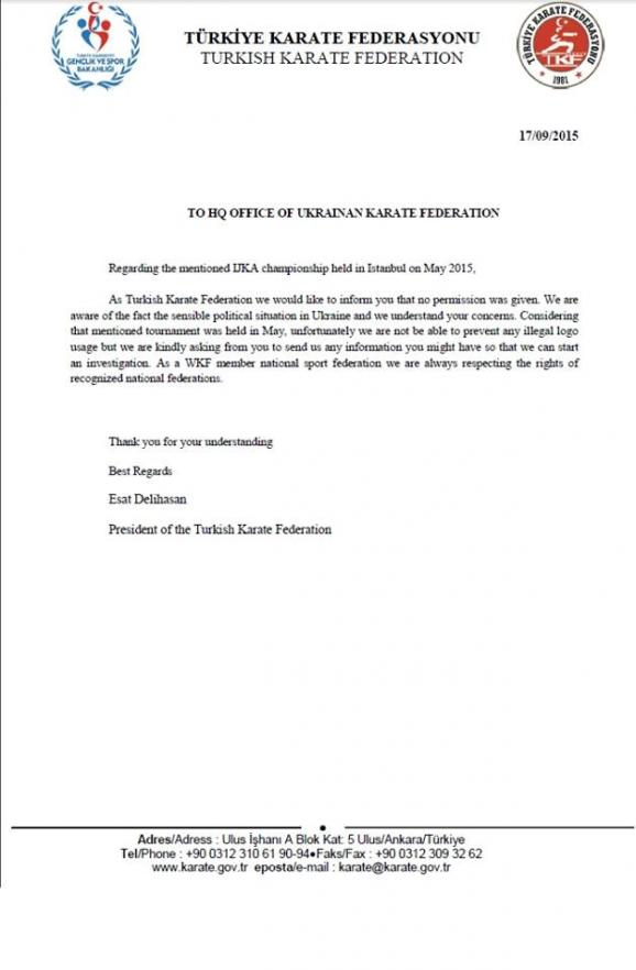 "Також він заявив, що всі заходи з карате на території Туреччини відбуваються лише за погодженням з Національною Федерацією (єдиною!), проте даний захід таких погоджень не отримував. Отже, був проведений незаконно. До того ж організатори розмістили символіку Всесвітньої та Турецької федерацій карате, що є ще грубим порушенням. У зв’язку з цим вони починають розслідування інциденту і просять нас надати всю наявну інформацію з цього приводу. Вважаю що МЗС та Мінмолодьспорт також повинні докласти зусиль для унеможливлення таких історій в майбутньому", - каже президент української федерації Сергій Левчук.