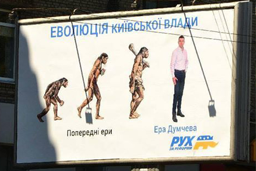 Лидер партии «Рух за реформы» Сергей Думчев предстаёт перед избирателем венцом творения, а вот его дизайнерам ещё есть куда расти: логотип подозрительно напоминает эмблему Республиканской партии США.