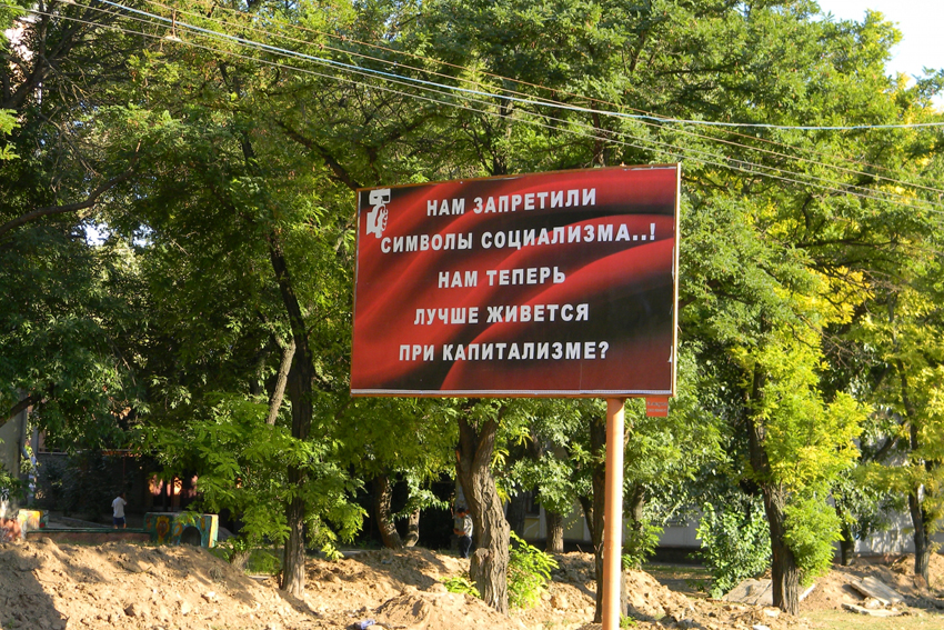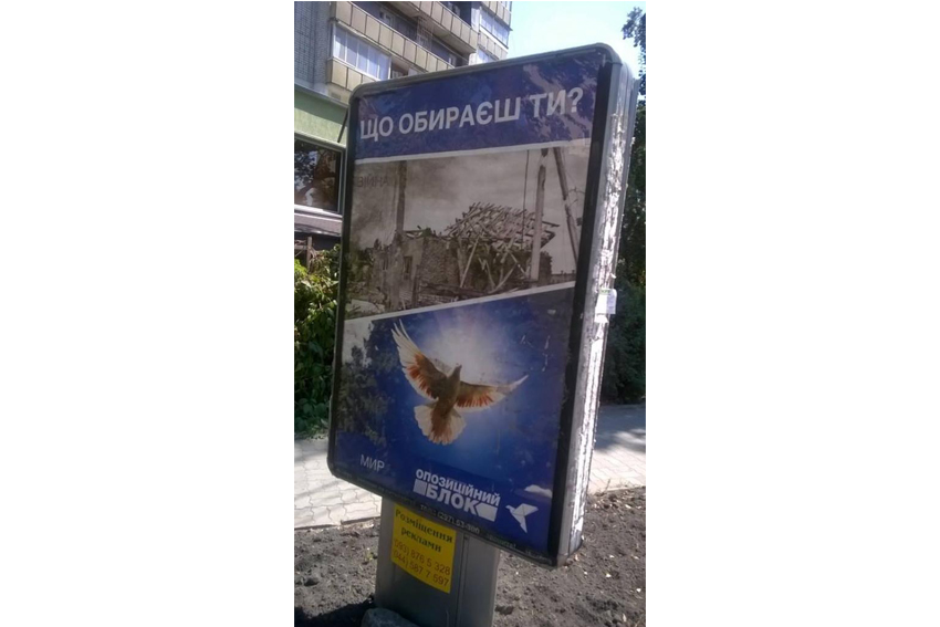 Оппозиционный блок оформляет свои плакаты бумажным голубем, символизирующим мир. Такое миролюбие удивительно, учитывая, что в бытность регионалами эти люди приложили немало усилий, чтобы создать в Донбассе специфическую атмосферу, приведшую к войне.