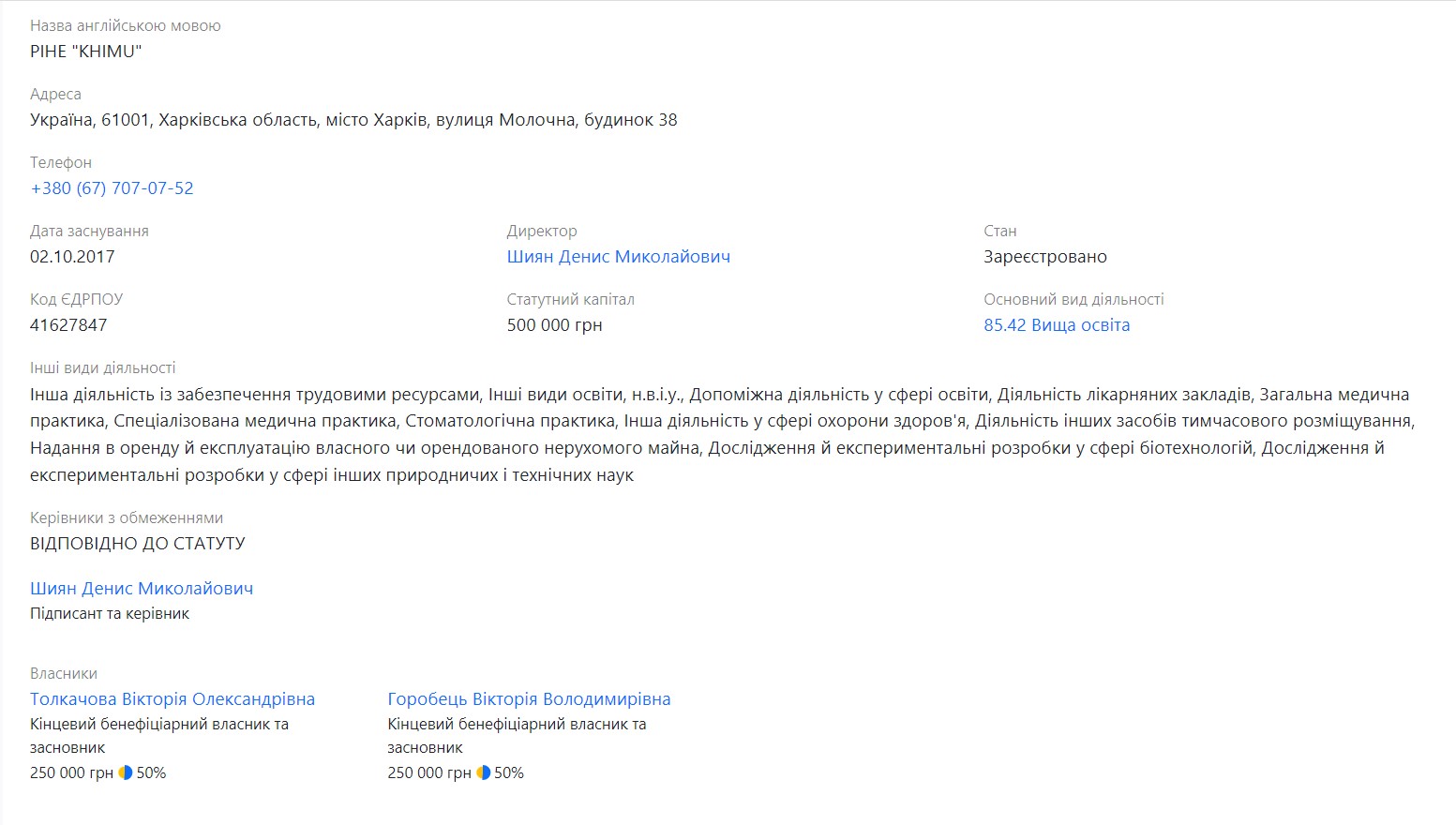 Серед таких не останнє місце посідає Харківський міжнародний медичний університет (ХММУ). Це приватний навчальний заклад, зареєстрований належним чином і має відповідні дозволи та ліцензії. Керівником, згідно з даними реєстрів, є Денис Миколайович Шиян, а бенефіціарами – Толкачова Вікторія Олександрівна та Горобець Вікторія Володимирівна.