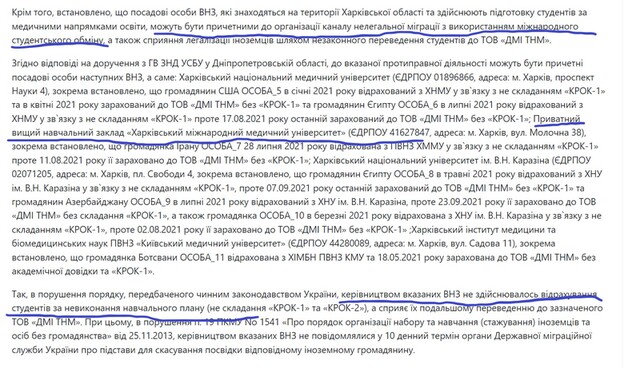 З матеріалів судових засідань випливає, що «посадові особи ВНЗ, які перебувають на території Харківської області та здійснюють підготовку студентів за медичними напрямками освіти, можуть бути причетними до організації каналу нелегальної міграції з використанням міжнародного студентського обміну, а також сприяння легалізації іноземців». І серед цих ВНЗ – Харківський міжнародний медичний університет. Який, серед інших, «причетний до організації каналу нелегальної міграції».